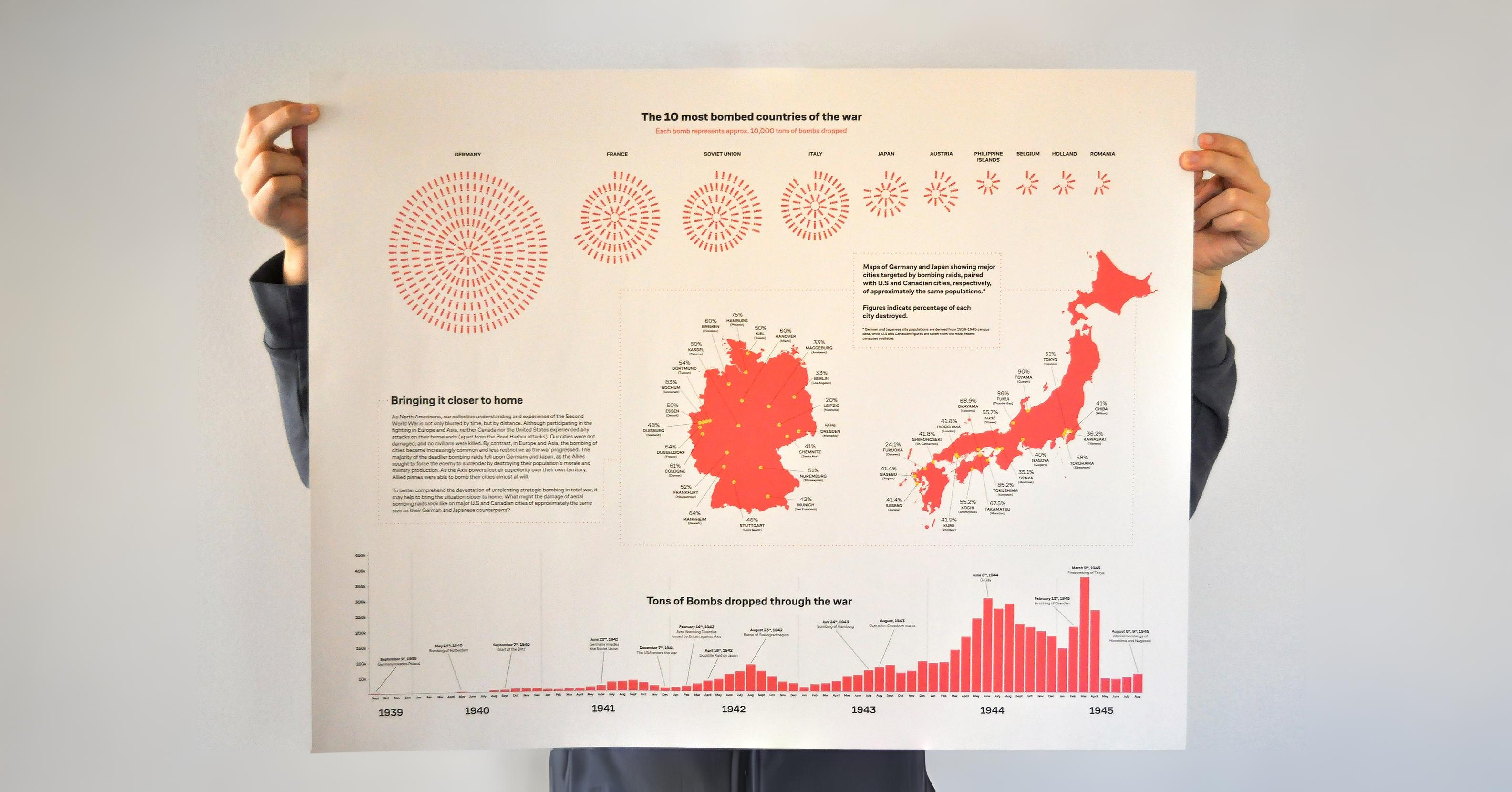 The Second World War is known as the deadliest conflict in history, yet as time passes, it risks becoming distant—something learned through dates and statistics rather than felt. This infographic was created to help students grasp the true scale of strategic bombing and its human impact.By transforming raw data into a clear visual narrative, the design invites viewers to see the magnitude of destruction in a more immediate, relatable way—bridging the gap between historical abstraction and human experience.